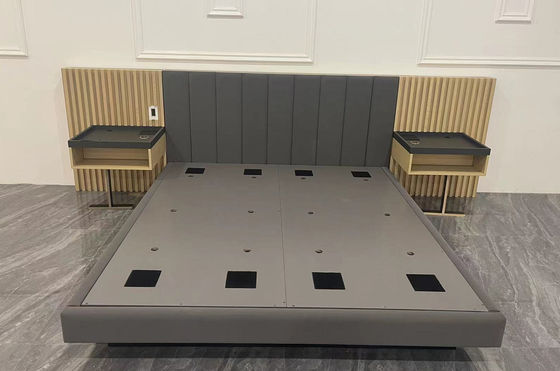 | Material: | Side panel is solid oak wood slats with 1''X 3/4'' shape,and middle with grey finish vinyl upholstery,with 2 night stands attached,night stand top with dark slate finish HPL,and bottom part with white oak wood veneer.Bed base is upholstery,with LED inserted,and bottom with black metal for toe kick. |